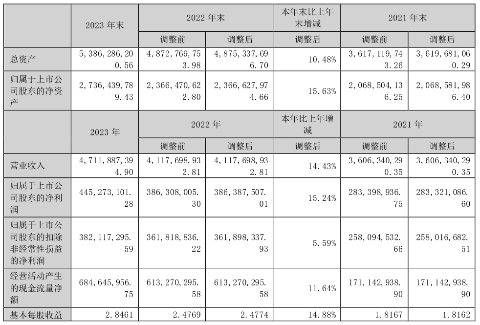 數據顯示,公司去年實現營業收入47.12億元,同比增長14.43%;銷售毛利率為36.61%,同比上升0.17個百分點;歸母淨利潤為4.45億元,同比增長15.24%;扣非後歸母淨利潤3.82億元,同比增長5.59%;基本每股收益2.85元,同比增長14.88%。