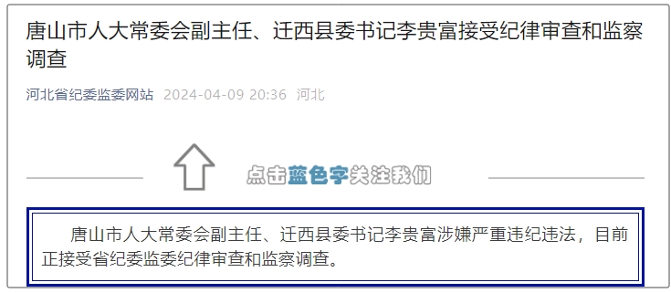 唐山市人大常委會副主任、遷西縣委書記李貴富接受紀律審查和監察調查 guancha 2024-04-09 微信公眾號“河北省紀委監委網站”4月9日消息,唐山市人大常委會副主任、遷西縣委書記李貴富涉嫌嚴重違紀違法,目前正接受省紀委監委紀律審查和監察調查。
