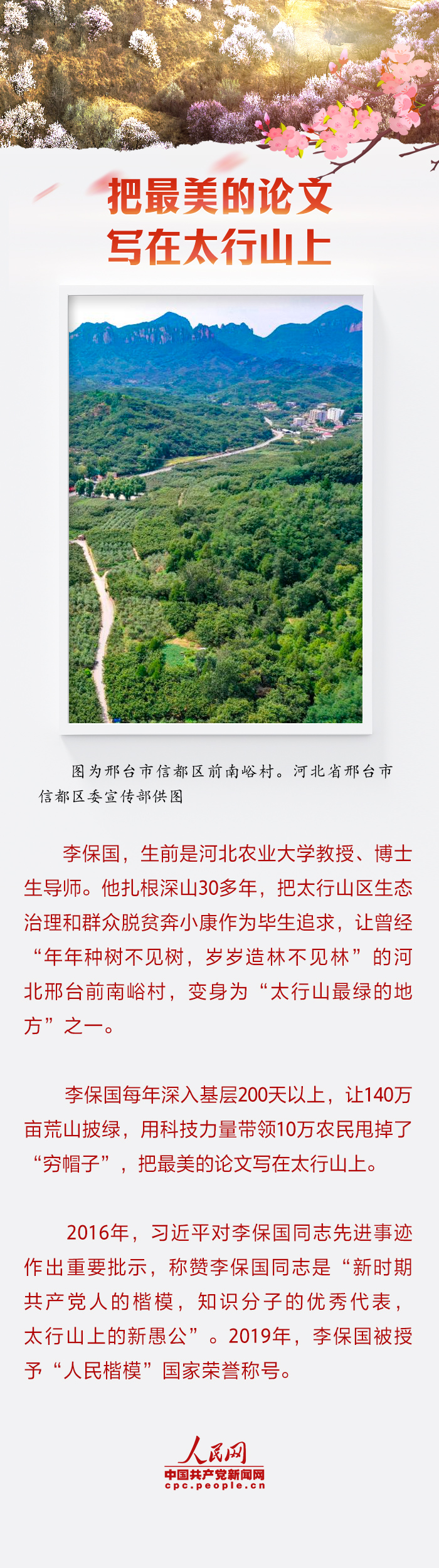 習近平總書記連續十多年履行與春天的“綠色約定”,心繫國土綠化事業,引領推進生態文明建設。“抓生態文明建設,既要靠物質,也要靠精神。”習近平總書記曾多次提到英模厚植精神之“樹”為人民謀幸福的事蹟,一起學習領悟。