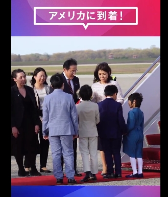 報道説,在機場,美方的儀仗隊和樂隊正在等候以國賓身份訪問的岸田,美方還鋪上了紅地毯,這些在普通的訪問時是不會出現的,這條紅毯似乎是專門為岸田首相夫婦等日方人員鋪設的。由於不被允許踩上紅地毯,其他日本官員被迫從另外一扇艙門下機,這與一般情況不同。