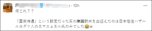 “這算啥事? ? 岸田到美國本應受到國賓待遇,但唯一歡迎他的是美國駐日本大使伊曼紐爾先生。”另一位日本網民説,“我還從沒見過這樣的國賓待遇。”