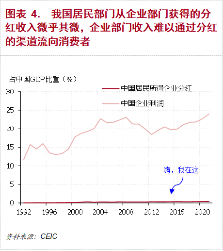 來自我國資金流量表的數據可以證明這一點。在過去20多年,儘管我國企業利潤佔GDP比重一直在20%左右波動,但我國居民部門獲得的企業分紅(包括國企和民企的分紅)卻一直不超過我國GDP的0.5%,微乎其微。(圖表 4)