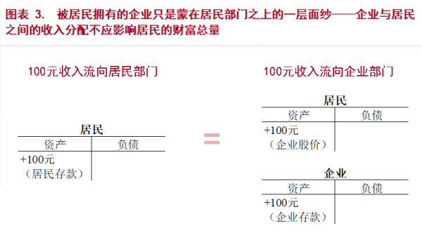 所以,如果企業部門的股權被居民部門持有,則不管收入是流向居民部門,還是流向企業部門,最終都會變成居民的財富。換言之,只要企業部門的股權在居民部門手裏,企業儲蓄和居民儲蓄就都是居民的財富,收入在企業與居民兩大部門之間的分配不影響居民的總財富規模。在經濟學裏,這個結論叫做“刺穿企業帷幕”(pierce the corporate veil)(圖表3)。