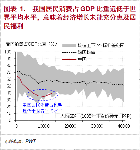 在組成內需的消費和投資兩塊中,消費才是最終需求,而投資只是派生性的需求。一般情況下,投資的目的是獲取投資回報。在投資回報率較低的時候,投資意願會比較低。如果此時收入不能自發從投資者手中轉移到消費者手中,變成更多的消費,就會出現消費與投資都弱的內需不足的情況。所以,我國消費佔GDP比重長期偏低,就會帶來內需的長期不足。
