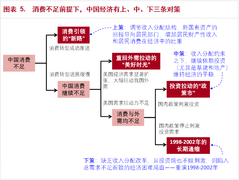 經濟的總需求由消費、投資和外需(淨出口)三部分組成。其中消費和投資可為我國自己掌握,外需則主要受外國影響。從我國消費不足的邏輯起點出發,我國有上、中、下三條對策可選:“上策”是通過有利於居民部門的收入分配改革來真正推進消費轉型;“中策”是在收入分配改革進展有限的情況下,通過刺激投資來穩定增長;“下策”則是在收入分配改革未取得實質性進展前,停止刺激投資(甚至打壓投資)。(圖表 5)