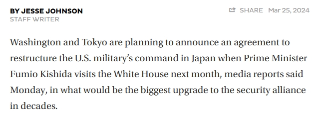 美日將在2024年4月宣佈重組駐日美軍指揮部計劃,聲稱將會是數十年以來的“最大升級”(圖片來源:外媒截圖)