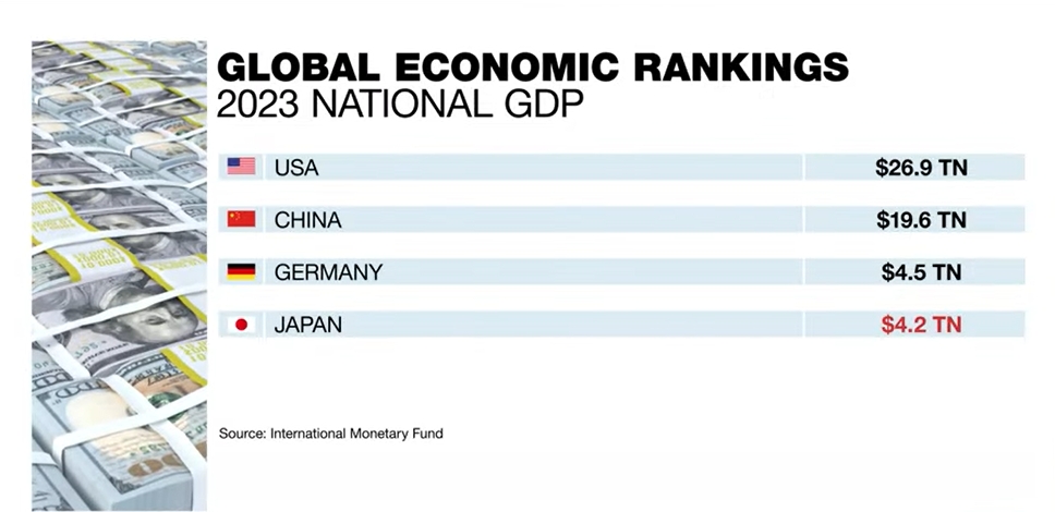 不過,事實是,2023年後半,日本經濟萎縮出乎全世界觀察家意外,第三大經濟體的地位被德國超越,成了第四名,IMF預估印度將於2026年超越日本。被中國或印度超越是合理的,畢竟中印人口龐大,但被德國超越就很沒面子了,德國人口只有日本的三分之二。