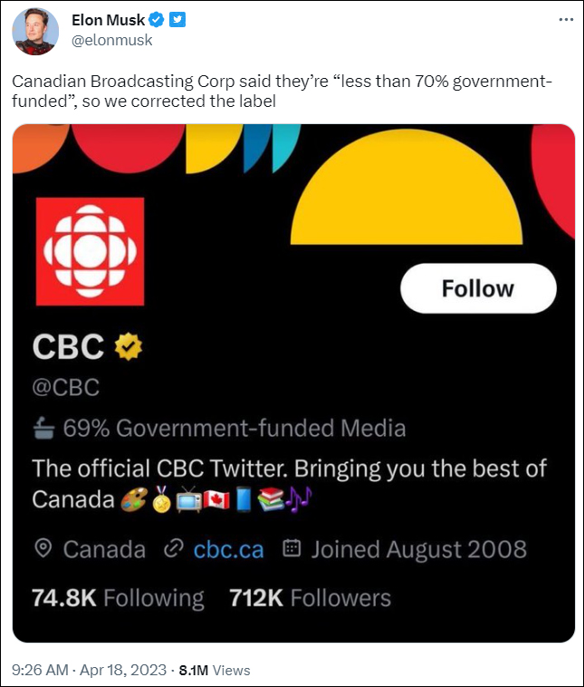 加拿大廣播公司(CBC)抗議後,馬斯克稱將其標籤改為“69%政府出資”,理由是CBC宣稱其“只有不到70%的政府資助”
