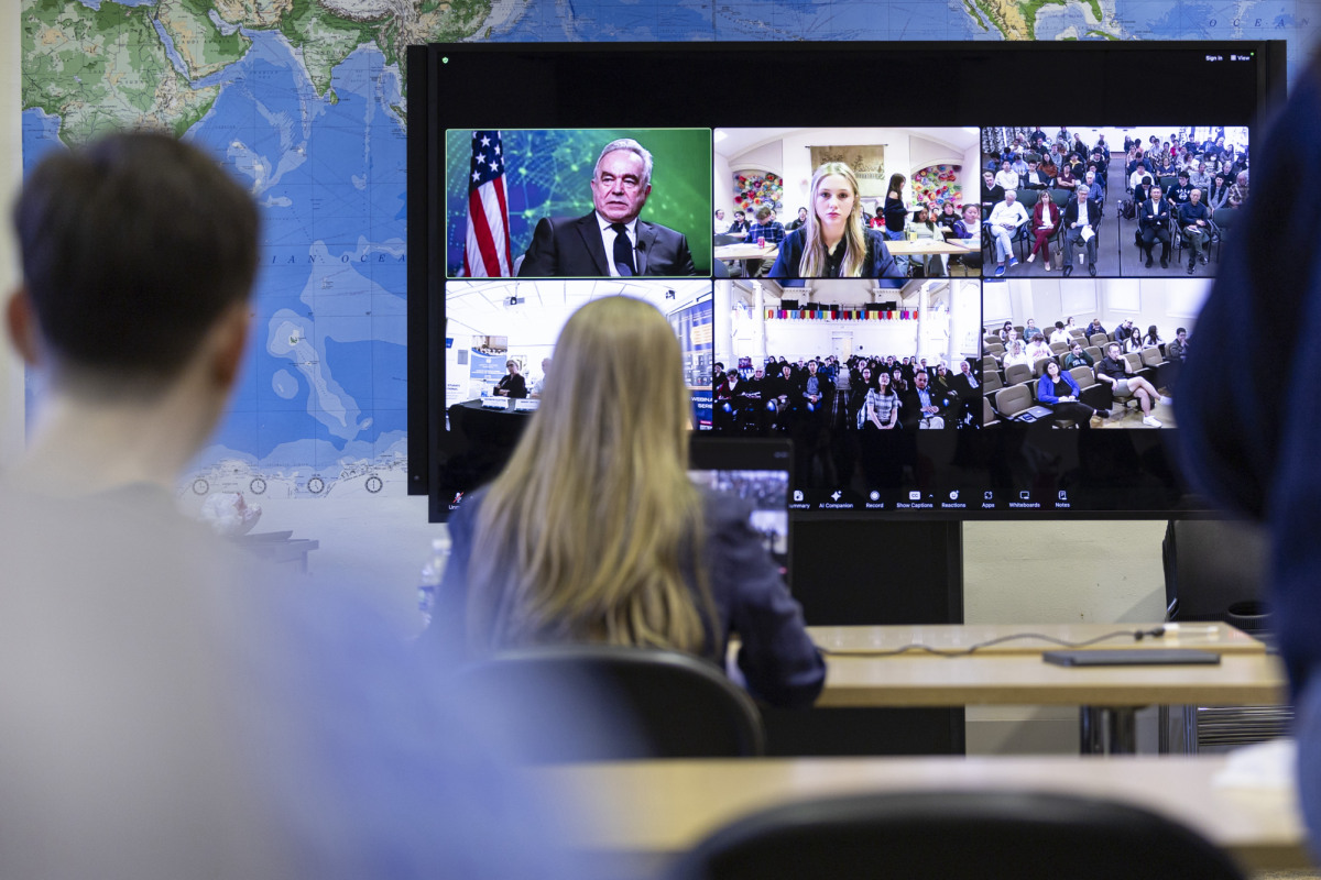 當地時間4月9日,美國常務副國務卿坎貝爾(左上)在視頻會議中談論美中關係,美國西北大學學生參與在線討論。(圖源:美國西北大學《西北日報》)