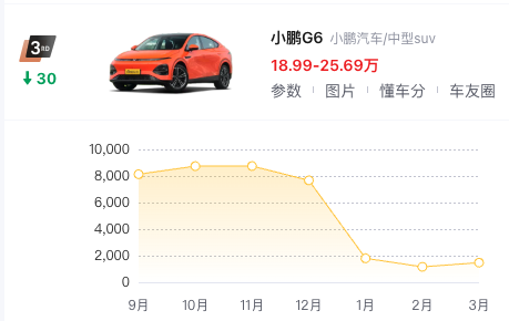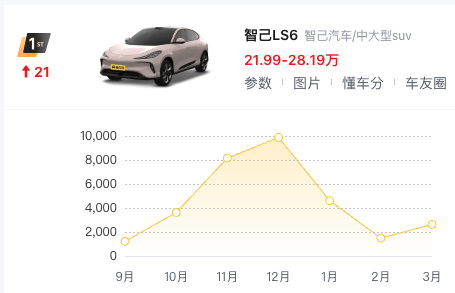 比如,曾經銷量出色的小鵬 G6 在開年後銷量遇到滑鐵盧,目前月銷不到 2000 台;智己的當家花旦 LS6 也在短暫的熱銷後,銷量回到了 2000 台附近。