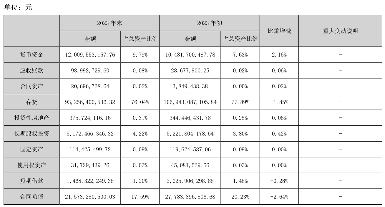 財報顯示,截至2023年末企業待售存量住宅(存貨)高達932.56億元,佔總資產的比重達到76.04%,若加上其已售未交付部分住宅產生的215.73億元合同負債,這一比例將上升至93.63%。