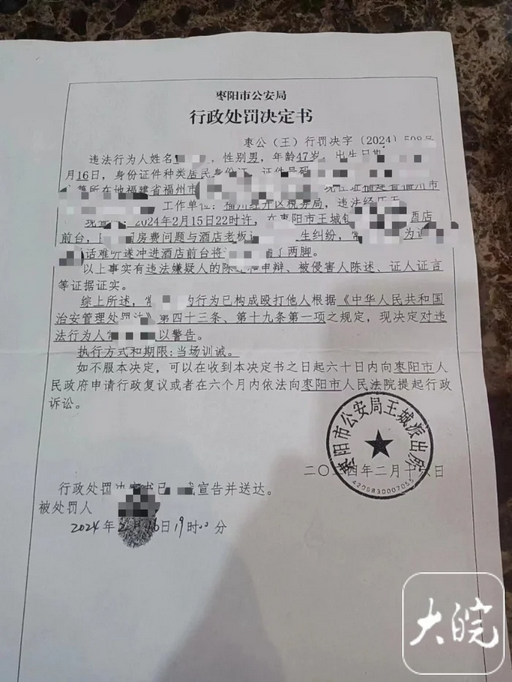從謝先生提供的一份行政處罰決定書可以看到,常某某系福州經開區税務局工作人員,2024年2月15日22時許,在棗陽市王城鎮某酒店前台,陳某因房費問題與酒店老闆謝先生髮生糾紛,常某某認為謝先生説話難聽,遂衝進酒店前台把謝先生踹了兩腳。棗陽市公安局王城派出所認為,常某某的行為已構成毆打他人,決定對常某某處以警告,執行方式和期限是當場訓誡。