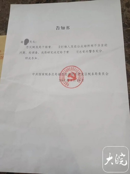 謝先生在向福州税務部門舉報之後,得到一份告知書,其中顯示,福州經開區税務局對於謝先生反映的該局幹部常某某毆打他人及在公眾場所有不當言論問題,經調查,研究決定給予常某某同志黨內警告處分。