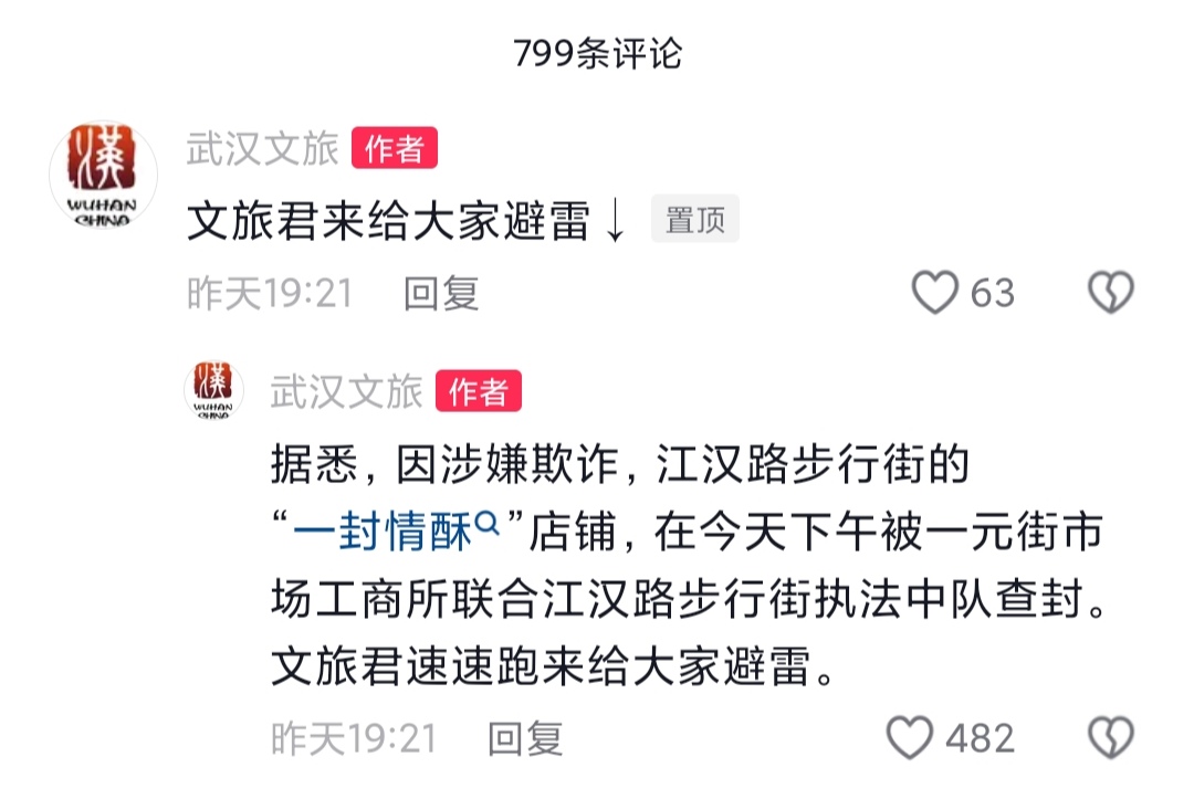武漢市文化和旅遊局11日在社交平台針對網傳“一女子買5塊雪花酥花681元”回應稱,因涉嫌欺詐,江漢路步行街的“一封情酥”店鋪,在4月10日下午被一元街市場工商所聯合江漢路步行街執法中隊查封。