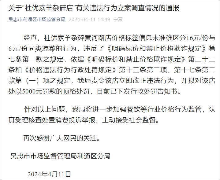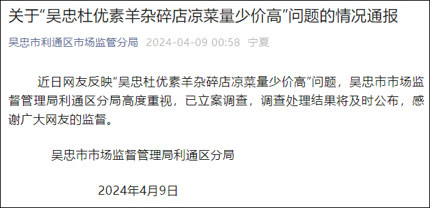 寧夏吳忠市市場監督管理局利通區分局微信公眾號“吳忠市利通區市場監管分局”4月11日發佈《關於“杜優素羊雜碎店”有關違法行為立案調查情況的通報》。