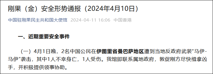 我駐剛果(金)使館通報:有中國公民遭襲擊身亡,有人被綁架