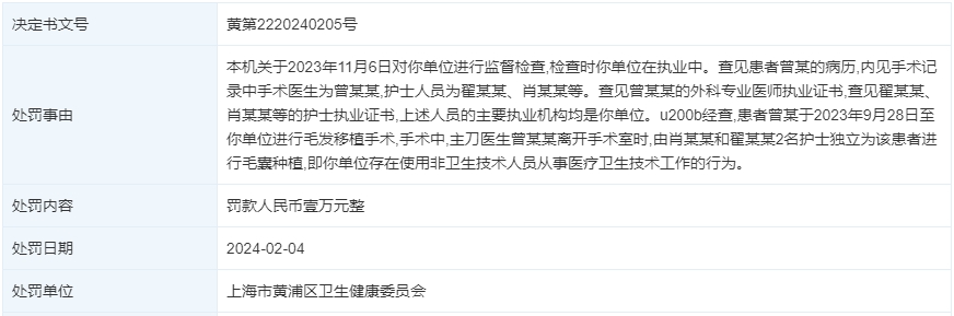 天眼查數據顯示,這例處罰背後的事由竟然是,患者在植髮手術進行到一半時,手術醫生中途悄無聲息離場,換成了兩名護士代為進行。