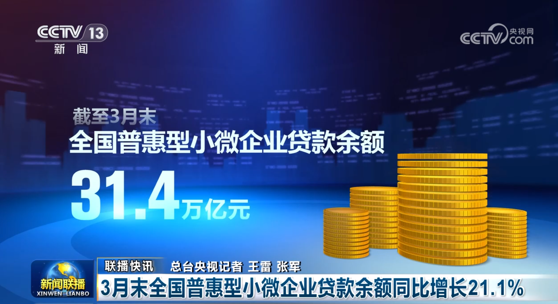 (2)3月末全國普惠型小微企業貸款餘額同比增長21.1%;