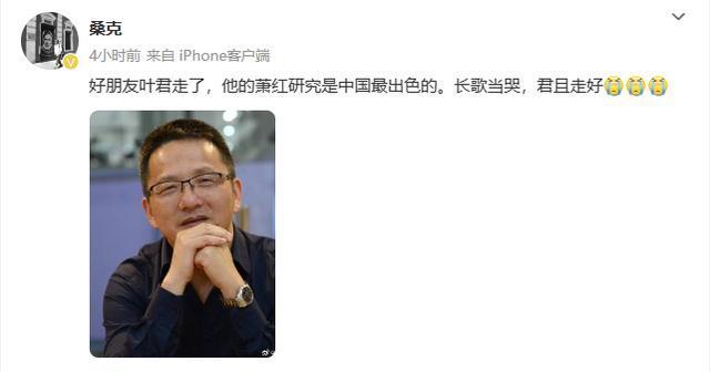 詩人桑克4月10日在社交媒體發文“好友葉君走了,他的蕭紅研究是中國最出色的。長歌當哭,君且走好。”