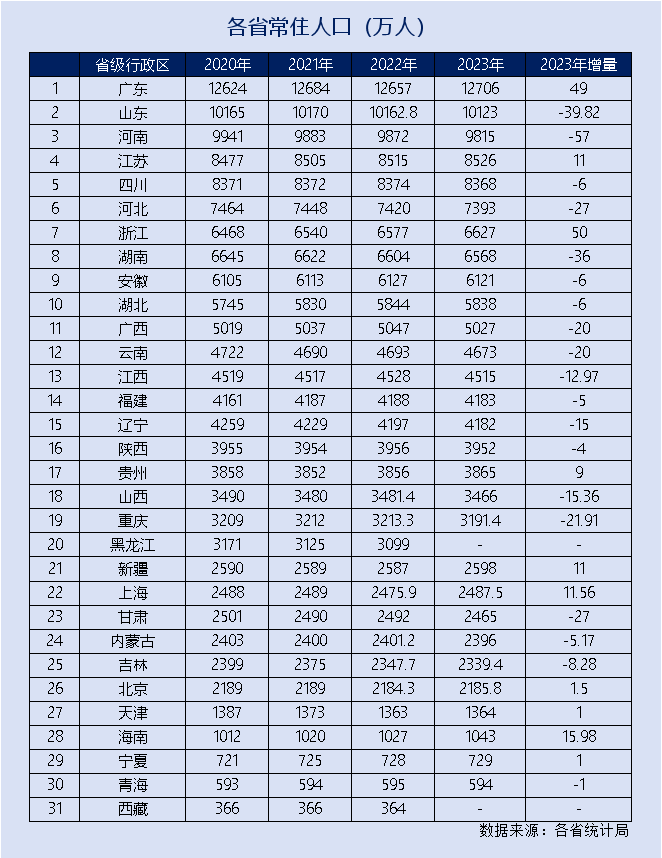 2023年度,部分省市常住人口排名位次出現變動,其中浙江省常住人口反超湖南,位列全國第7。2023年末,浙江省常住人口較去年同期增加50萬人至6627萬人,增量居全國首位;湖南省則較去年同期減少36萬人至6568萬人。