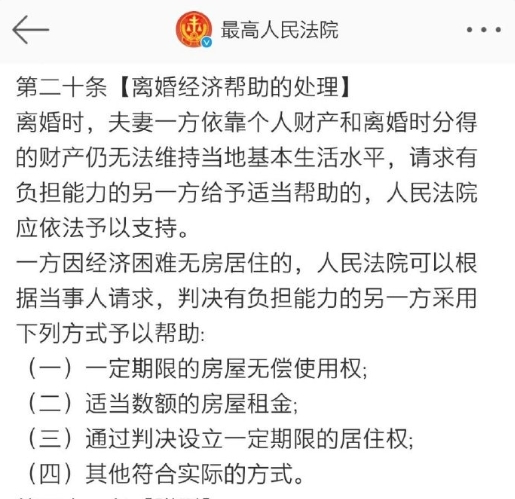幫助的方式可以是一定期限的房屋無償使用權、適當數額的房屋租金、通過判決設立一定期限的居住權和其他符合實際的方式。也就是説,這個幫助主要是因為一方離婚後無房造成生活比較困難,另一方在居住方面給予的幫助。所以,當看懂了第20條後,離婚經濟幫助制度沒有想像的那麼可怕。