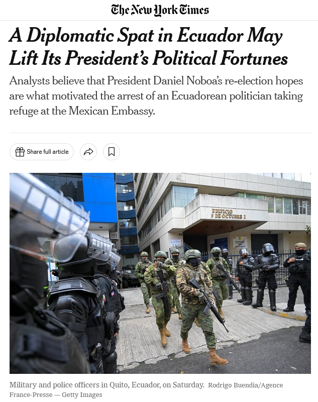 《紐約時報》4月7日發文:此次外交糾紛將提升厄瓜多爾總統諾沃亞的“政治運勢”(圖片來源:《紐約時報》截圖)