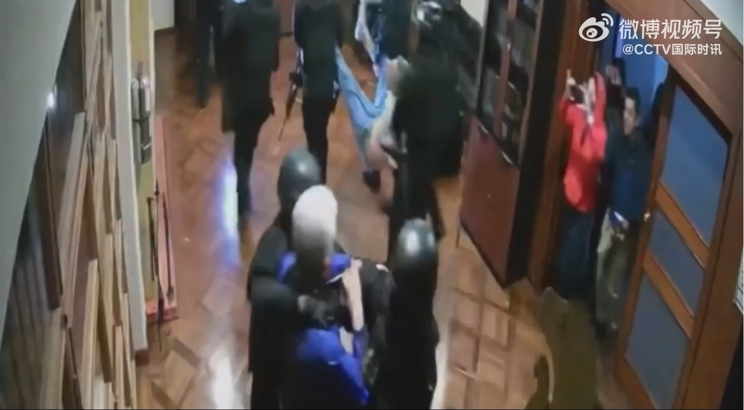 4月9日,墨西哥總統洛佩斯在新聞發佈會上,播放了厄瓜多爾警方闖入使館的監控錄像(圖片來源:CCTV國際時訊微博視頻截圖)