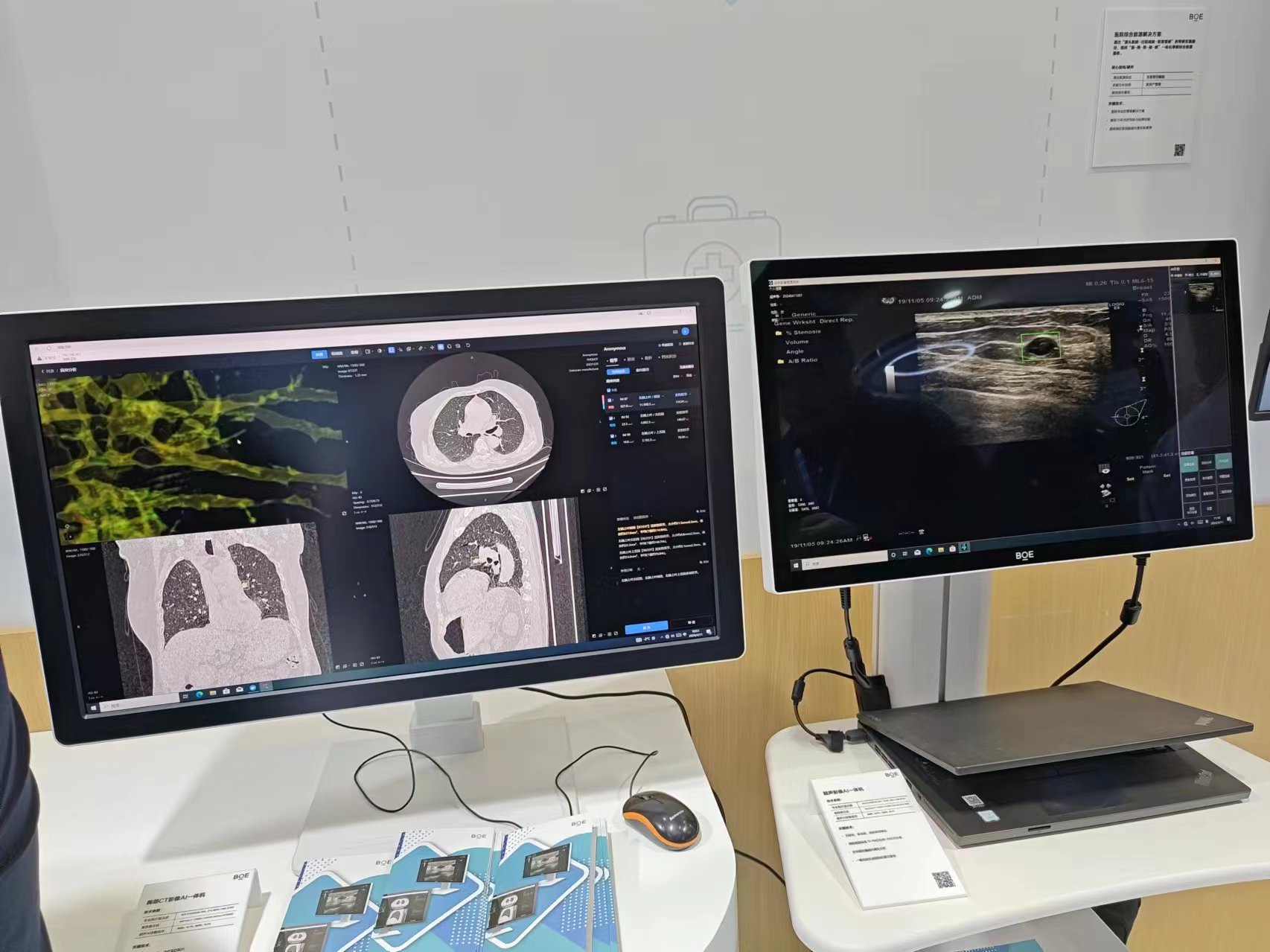 面向社區基層醫院,BOE(京東方)重磅推出了新一代超聲影像AI一體機,搭載AI醫學智能影像系統,通過AI自動識別病灶,大幅提升超聲檢查的病灶檢出率與準確性。BOE(京東方)胸部CT影像AI一體機可智能識別分析並一鍵生成檢測報告,為醫生提供高效的AI輔助診斷,目前已支持肺結節、肺炎、肋骨骨折、鈣化積分等多類靜態影像檢測項。