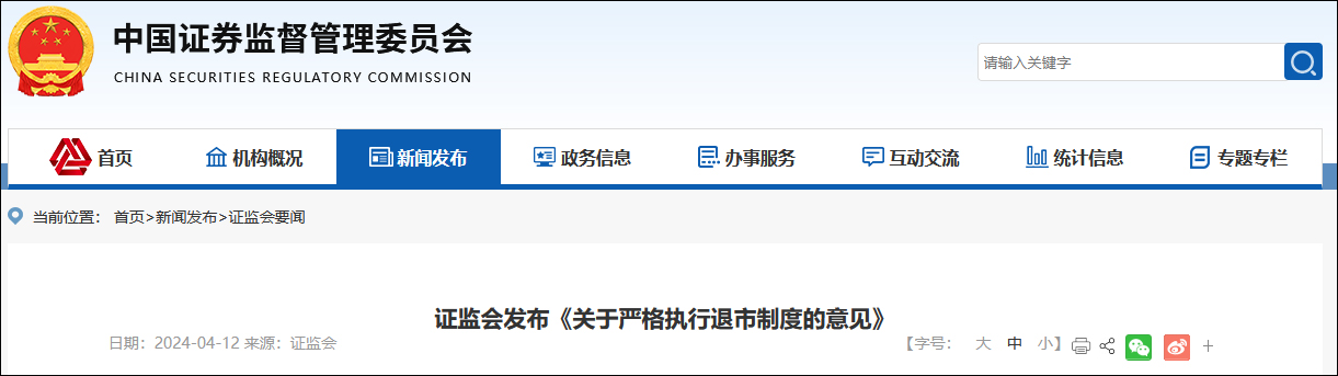 據證監會網站4月12日消息,為深入貫徹落實中央金融工作會議以及《國務院關於加強監管防範風險推動資本市場高質量發展的若干意見》精神,進一步深化退市制度改革,實現進退有序、及時出清的格局。證監會在認真總結改革經驗和充分考慮國情市情的基礎上,制定《關於嚴格執行退市制度的意見》(以下簡稱《退市意見》)。