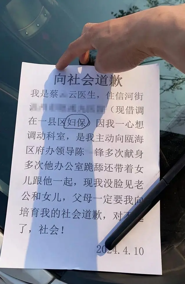 另有網傳圖片和視頻顯示,有停放在路邊的車輛雨刮器下壓了一張紙,紙上內容是以蔡某某的角度“向社會道歉”,落款時間為今年4月10日。