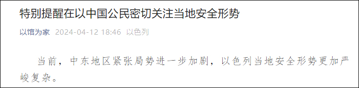 據中國駐以色列大使館領事部微信公眾號“以館為家”4月12日消息,當前,中東地區緊張局勢進一步加劇,以色列當地安全形勢更加嚴峻複雜。