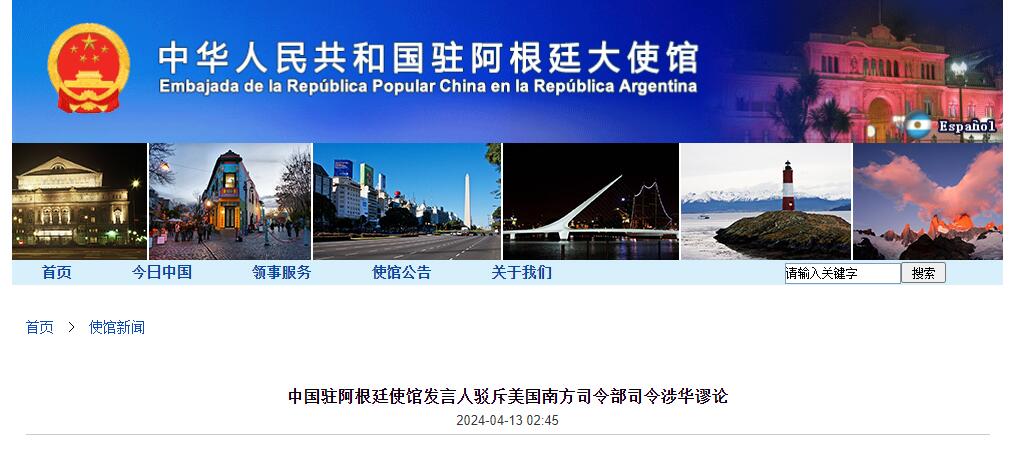 4月13日,中國駐阿根廷使館發言人駁斥美國南方司令部司令涉華謬論。