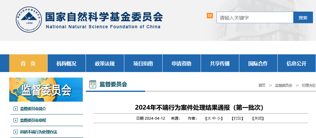 據國家自然科學基金委員會網站12日消息,近期,經國家自然科學基金委員會監督委員會調查審議、國家自然科學基金委員會委務會議審定,國家自然科學基金委員會對相關科研不端案件涉事主體進行了處理。現根據有關規定,將有關案情及處理結果予以通報。