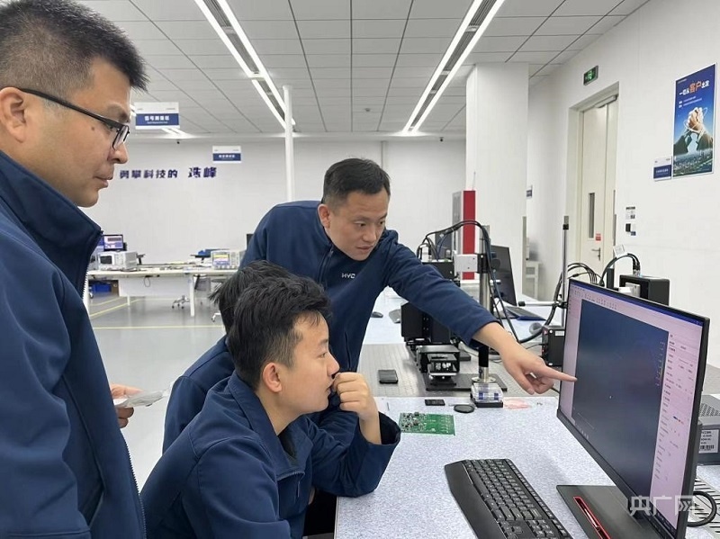 韓傳雲(右一)和團隊成員在討論技術指標(央廣網記者 欒永勝 攝)