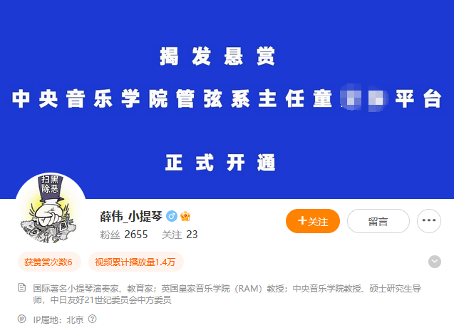 據澎湃新聞此前報道,今日,一位賬號簡介為“中央音樂學院教授薛偉”的微博賬號發帖稱,公開懸賞徵集同校管絃系主任童某某違法線索。舉報賬號簡介顯示“國際著名小提琴演奏家、教育家,中央音樂學院教授、碩士研究生導師等”。