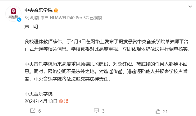 我校退休教師薛偉,於4月4日在網絡上發佈了揭發懸賞中央音樂學院某教師平台正式開通等相關信息。學校黨委對此高度重視,立即依規依紀依法進行調查核實。