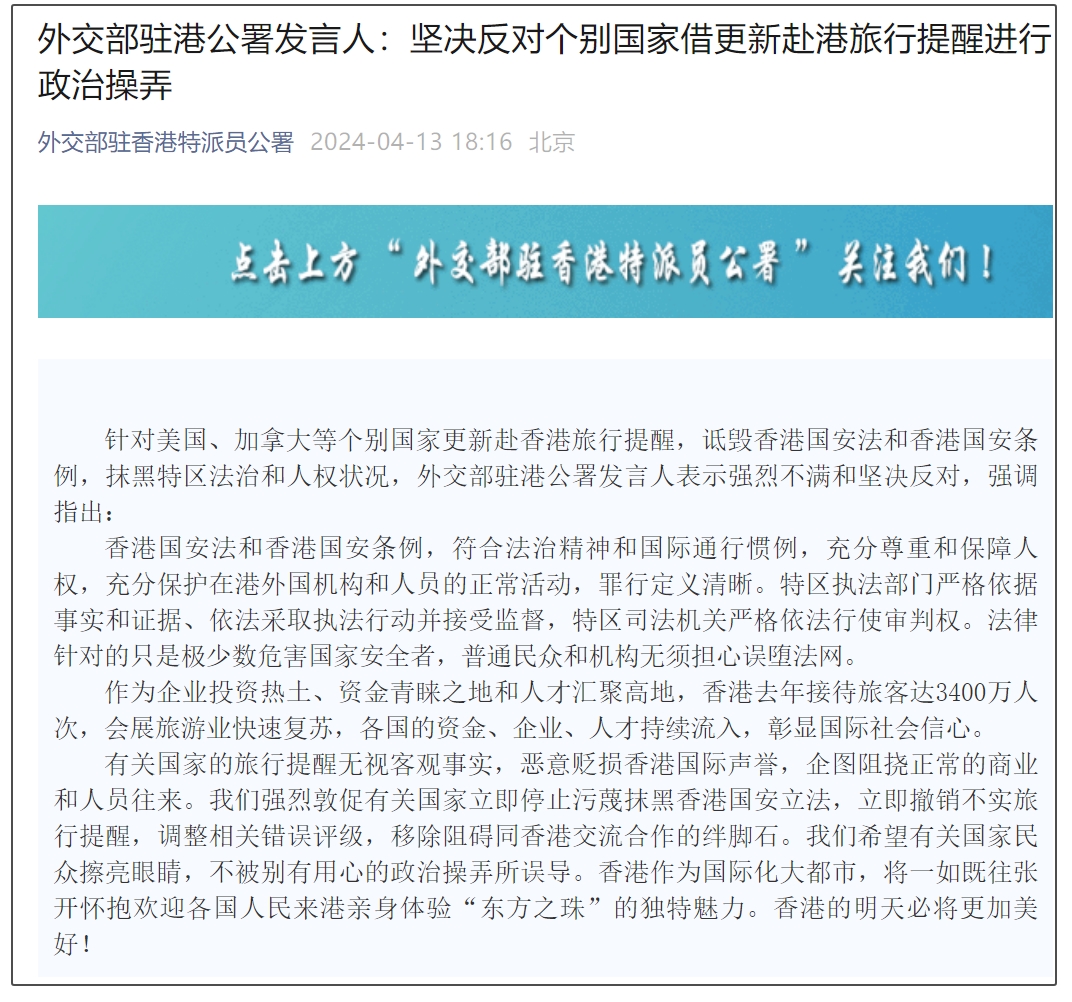 微信公眾號“外交部駐香港特派員公署”4月13日消息,針對美國、加拿大等個別國家更新赴香港旅行提醒,詆譭香港國安法和香港國安條例,抹黑特區法治和人權狀況,外交部駐港公署發言人表示強烈不滿和堅決反對,強調指出: