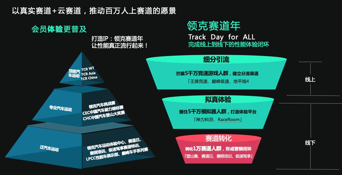 在線下,領克全力打造了由愛好者到專業車手自下而上的金字塔進階體系,對於廣大汽車運動愛好者,領克設置了賽道日、極速駕享、賽照培訓、巔峯車手系列賽等泛汽車運動;對於專業的汽車運動從業者,“領克汽車挑戰賽”“中國汽車登山錦標賽”“CEC(中國汽車耐力錦標賽)”為他們提供了高水平的賽事平台;而對於頂尖的車手,領克汽車則提供了TCR系列賽的晉升通道,滿足不同汽車運動愛好者需求的同時也在為中國汽車運動培養優秀的人才。