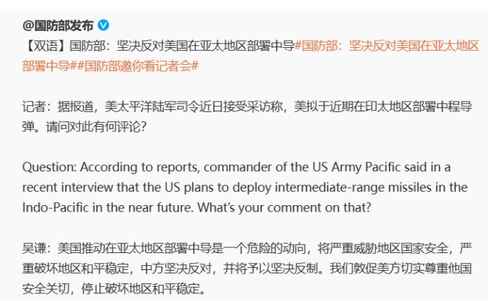 在特朗普任內美國退出中導條約,將近6年後,美國又一次大肆炒作“在中國周邊部署陸基中導”,大有將日本變為冷戰西德之意,而這種刻意炒作無疑是向我方傳達一種明確的威脅信號。雖然日美同盟在亞太地區增兵不是什麼新聞,但揚言部署中導就正如中國國防部回應的那樣——既不尊重我國的安全關切,也在破壞地區和平穩定。當然,要是美國不搞霸權主義,認真考慮他國安全關切,世界也不會像今天這般動盪。