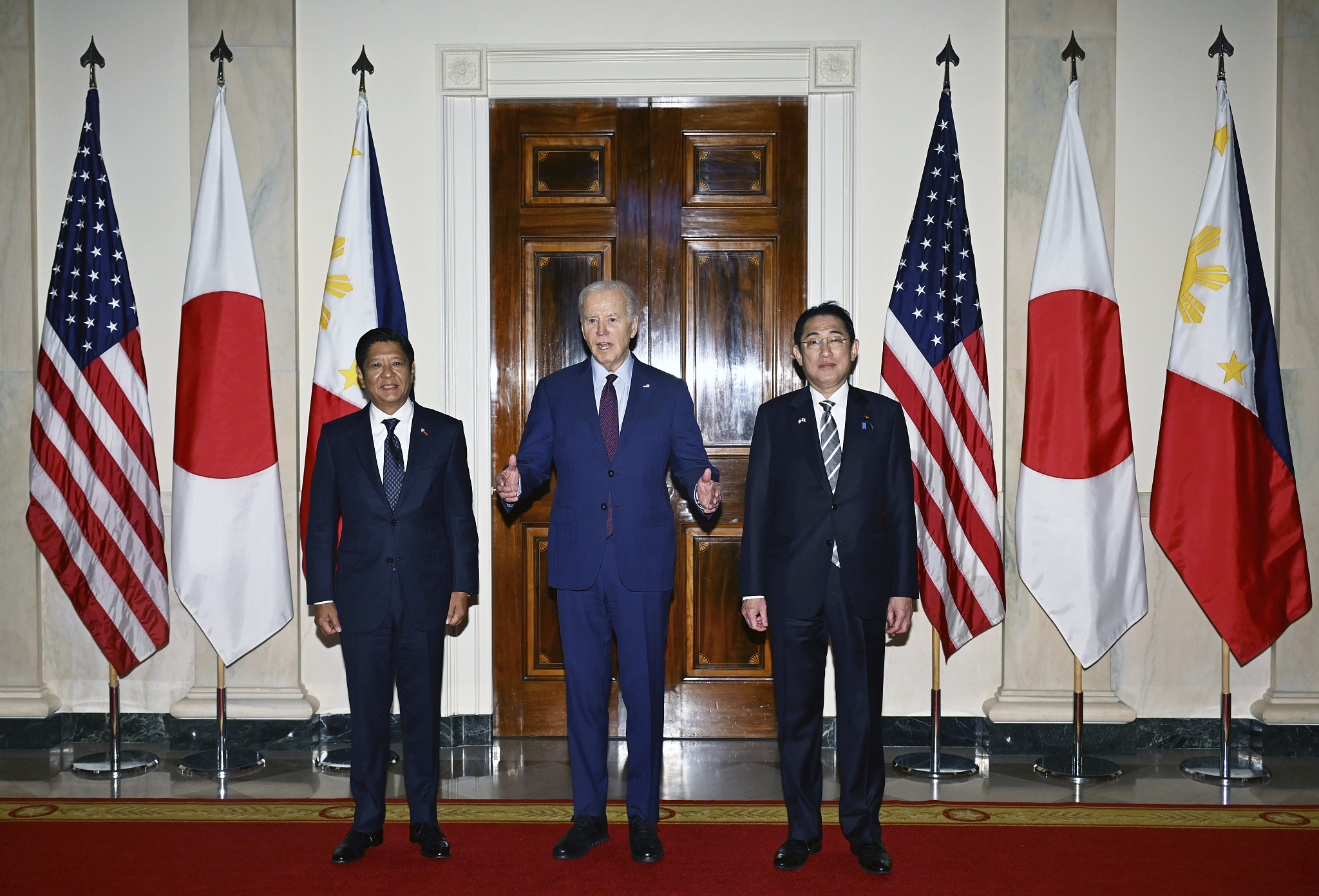 當地時間4月11日,馬科斯、拜登和岸田文雄在華盛頓舉行會談 圖源:視覺中國