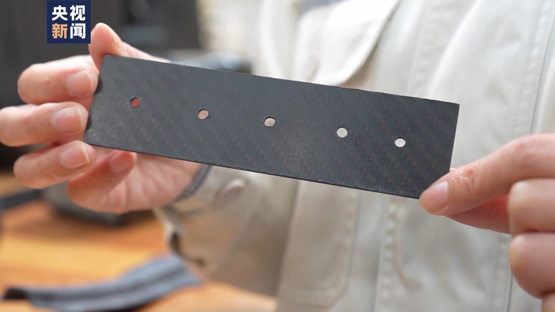 中車四方股份公司高速動車組總體高級主任設計師 聶穎:我手裏拿的是一個碳纖維的墊片,像CR450,設備艙還有排障器都應用了碳纖維材料,比傳統材料能夠降低30%的重量,這樣車身更輕,跑起來能耗更低。