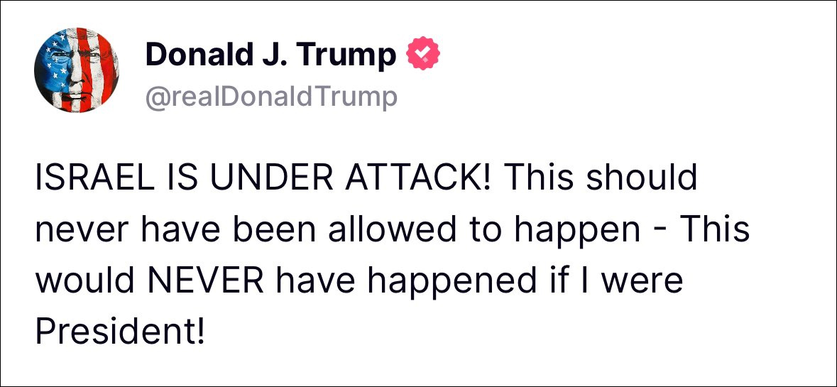 特朗普表示,美國正在為以色列祈禱,並會向所有處於危險中的人提供絕對的支持。“這是一場本不可能發生的襲擊。我的意思是,想想,想想你必須要經歷的事情。”他接着説:“烏克蘭(俄烏衝突)就永遠不會發生,以色列在(去年)10月7日和今天都遭到襲擊是不可能發生的。”