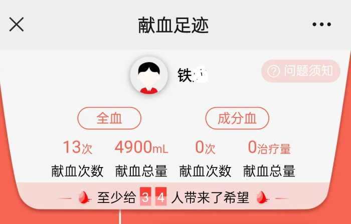 鐵先生在帖子中配了自己獻血足跡的截圖,其中顯示,他獻了13次全血,獻血總量是4900ml。