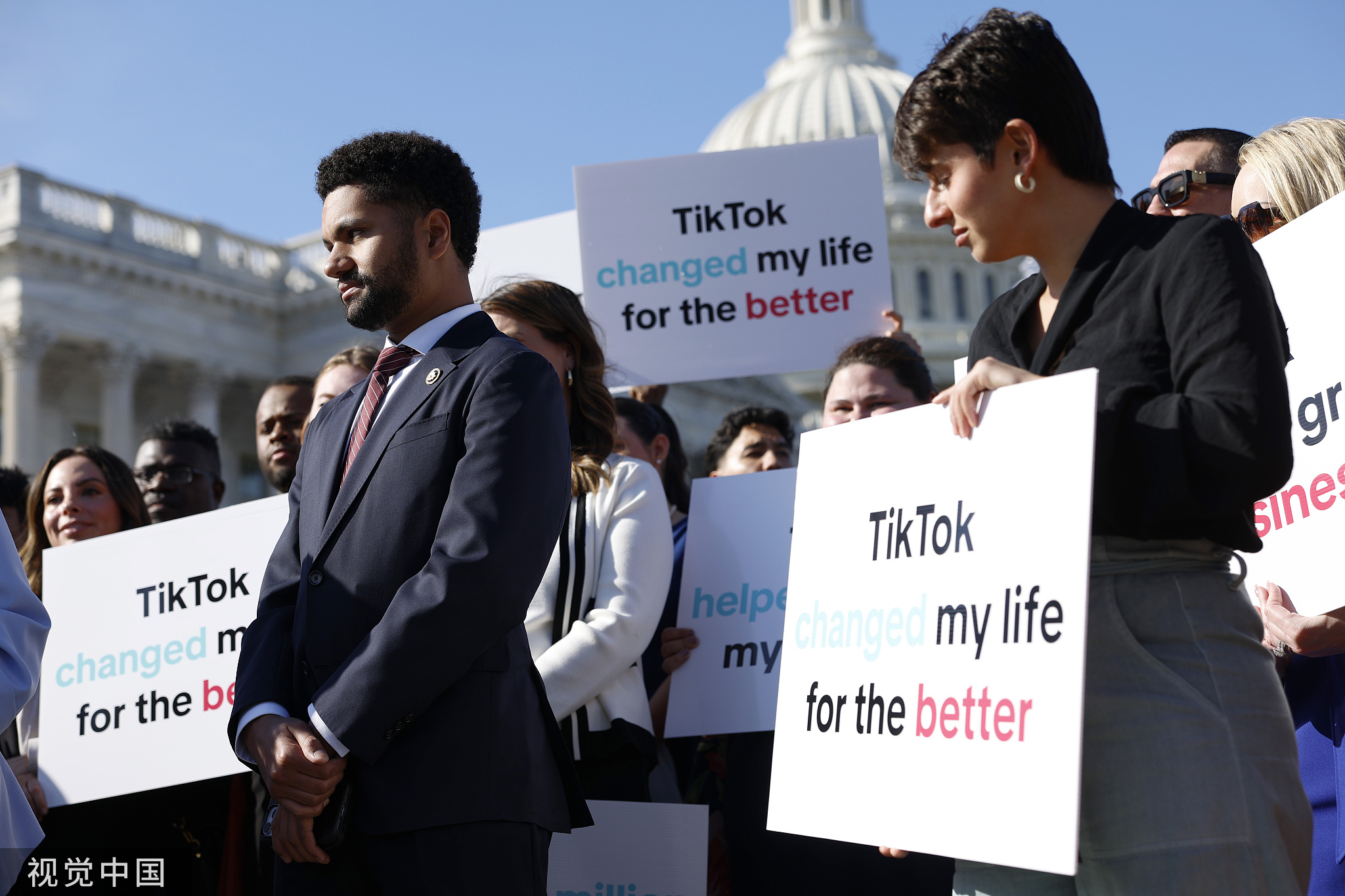 3月12日,多名TikTok博主在國會前抗議。圖自視覺中國
