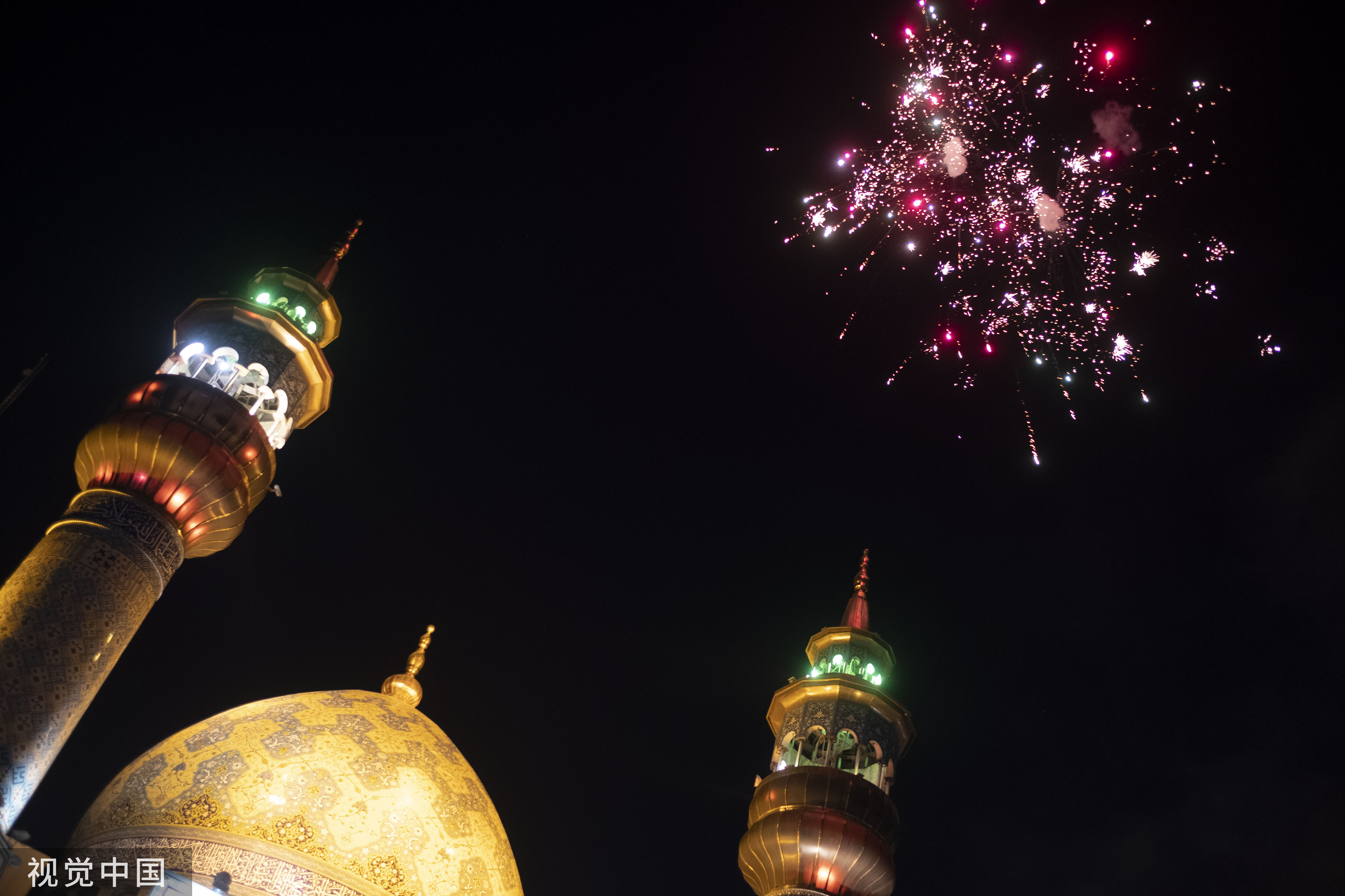 4月14日,伊朗德黑蘭,伊朗對以發動襲擊,一座清真寺在慶祝活動中燃放煙花。圖:視覺中國