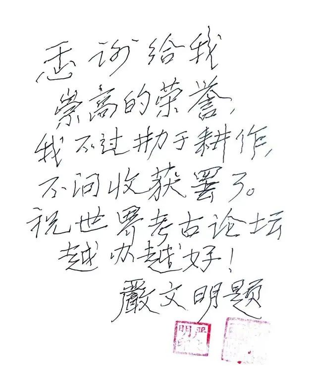 嚴文明手寫的獲獎感言:“感謝給我崇高的榮譽,我不過勤於耕作,不問收穫罷了。”