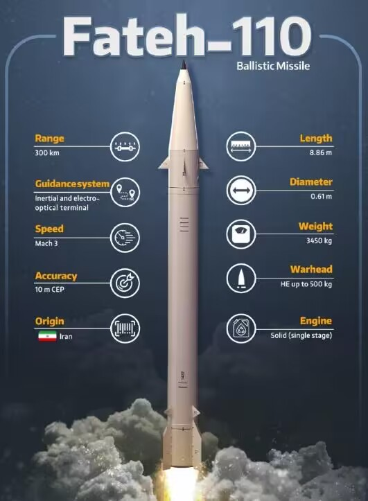 法塔赫-110”導彈,該型彈已發展出至少4種型號,精度最高的“法塔赫-110D”的命中誤差低於10米,最大射程約250公里。伊朗自用型號多為A型、C型,射程可達300公里。該導彈脱胎於中國出口的“B610”對地戰術導彈