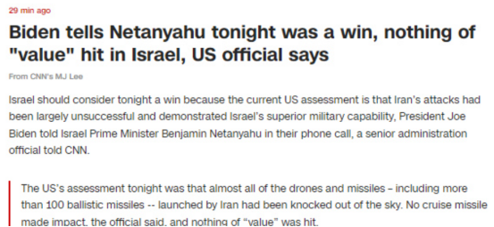 在目前的情況下,為了阻止以色列把自己脱下水,美國政府一定會不惜一切代價阻止以色列公佈任何損失,最好直接定性一個0傷亡0損失。同時以這一宣傳口徑來換取以色列不要對伊朗及周邊國家進行報復,最終達到全力確保大選安全的目的。為此,拜登及其他的美方人員均稱此次攻擊為以色列“巨大的勝利”。