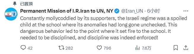 (觀察者網訊)據伊朗官方通訊社伊通社(IRNA)報道,當地時間15日,伊朗常駐聯合國代表團在其官方社媒賬號上發文稱,“不斷受到支持者的溺愛,以色列政權就像學校裏一個被寵壞的孩子,其異常行為長期得不到約束,這種危險的行為最終導致它縱火燒了學校。它需要被管教,而且管教也確實得到了執行!”