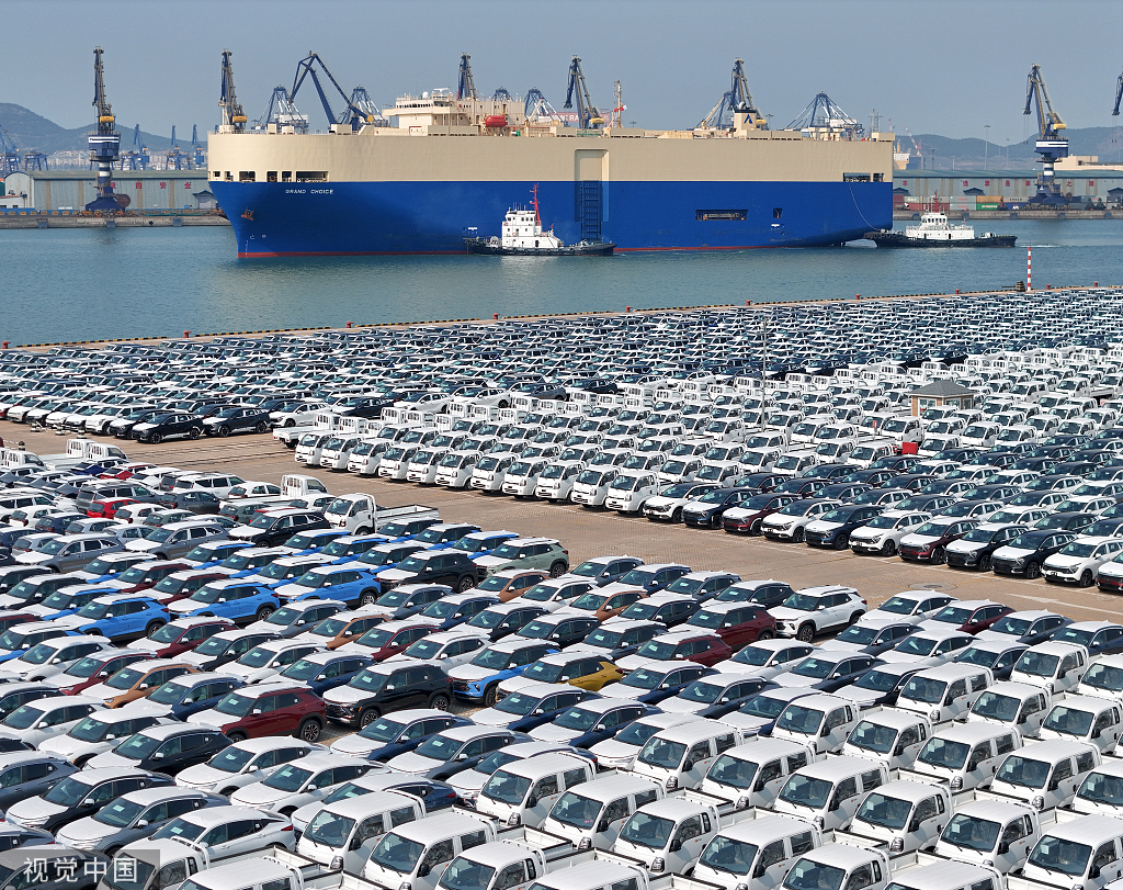 2024年4月5日,大批國產汽車在山東港口煙台港集結等待裝船出口。(圖源:視覺中國)